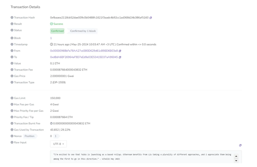“Jag är glad över att se att Taiko lanseras som en baserad rollup. Ethereum gynnas av att L2:s tar ett flertal olika tillvägagångssätt, och jag uppskattar att de är bland de första att gå i den här riktningen”, säger Buterin i blockets metadata.