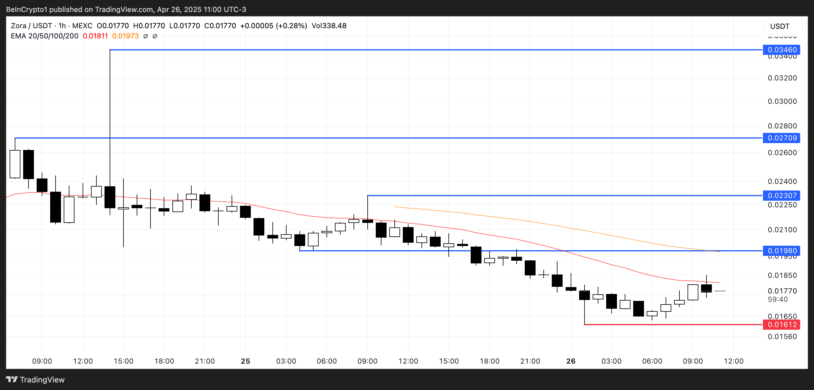 ZORA testade nyligen och höll stöd vid 0,016 USD, vilket visar motståndskraft efter sin volatila lansering. Om upptrenden fortsätter kan tokenen testa motstånd vid 0,0198 USD, och potentiellt röra sig mot 0,023 USD och 0,027 USD.