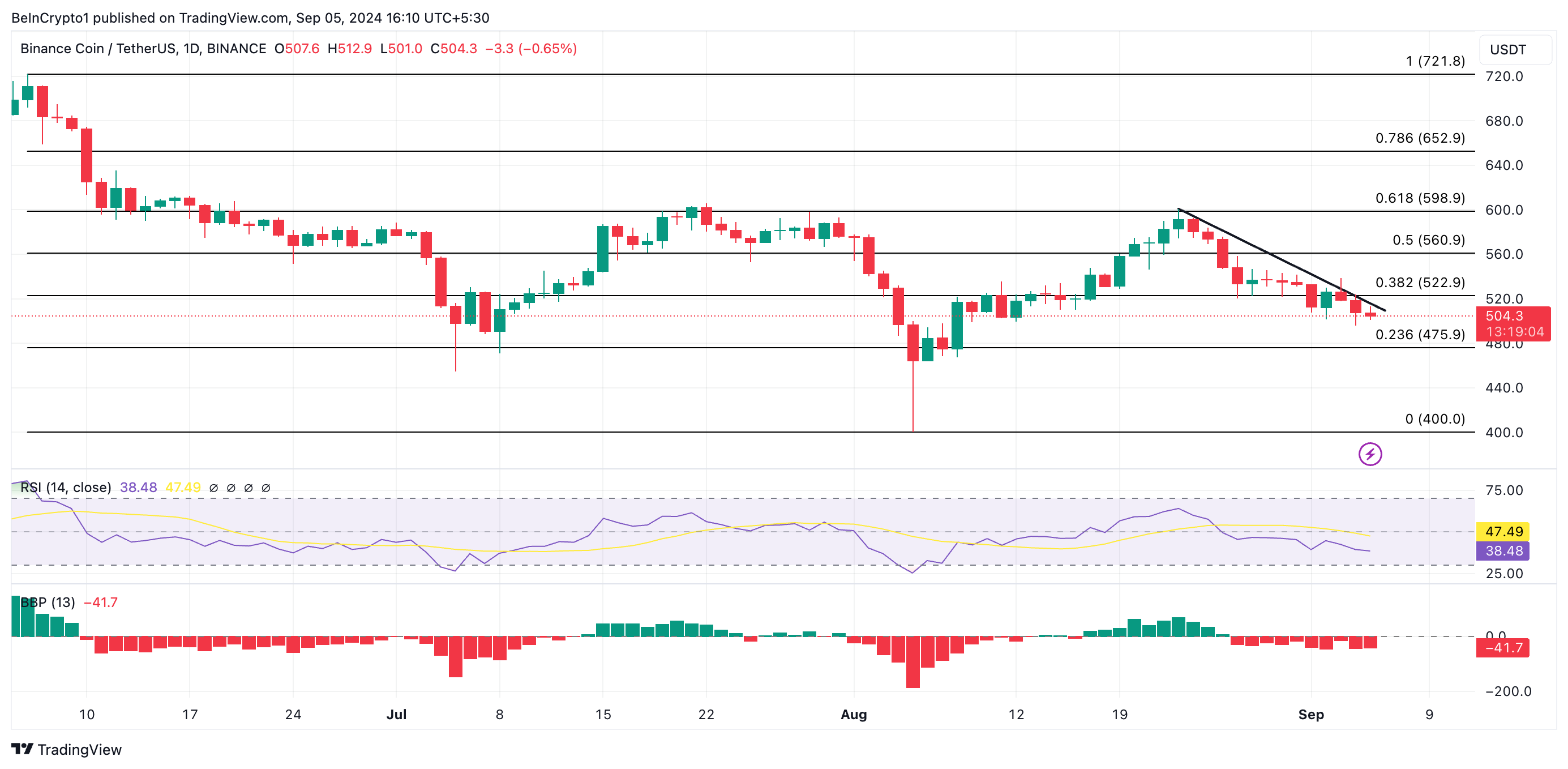 För närvarande handlas BNB till 504,63 USD, efter att ha sjunkit med 7% under den senaste veckan. Altcoinen har legat under en nedåtgående trendlinje, vilket indikerar negativ marknadssentiment och potential för ytterligare nedgångar.