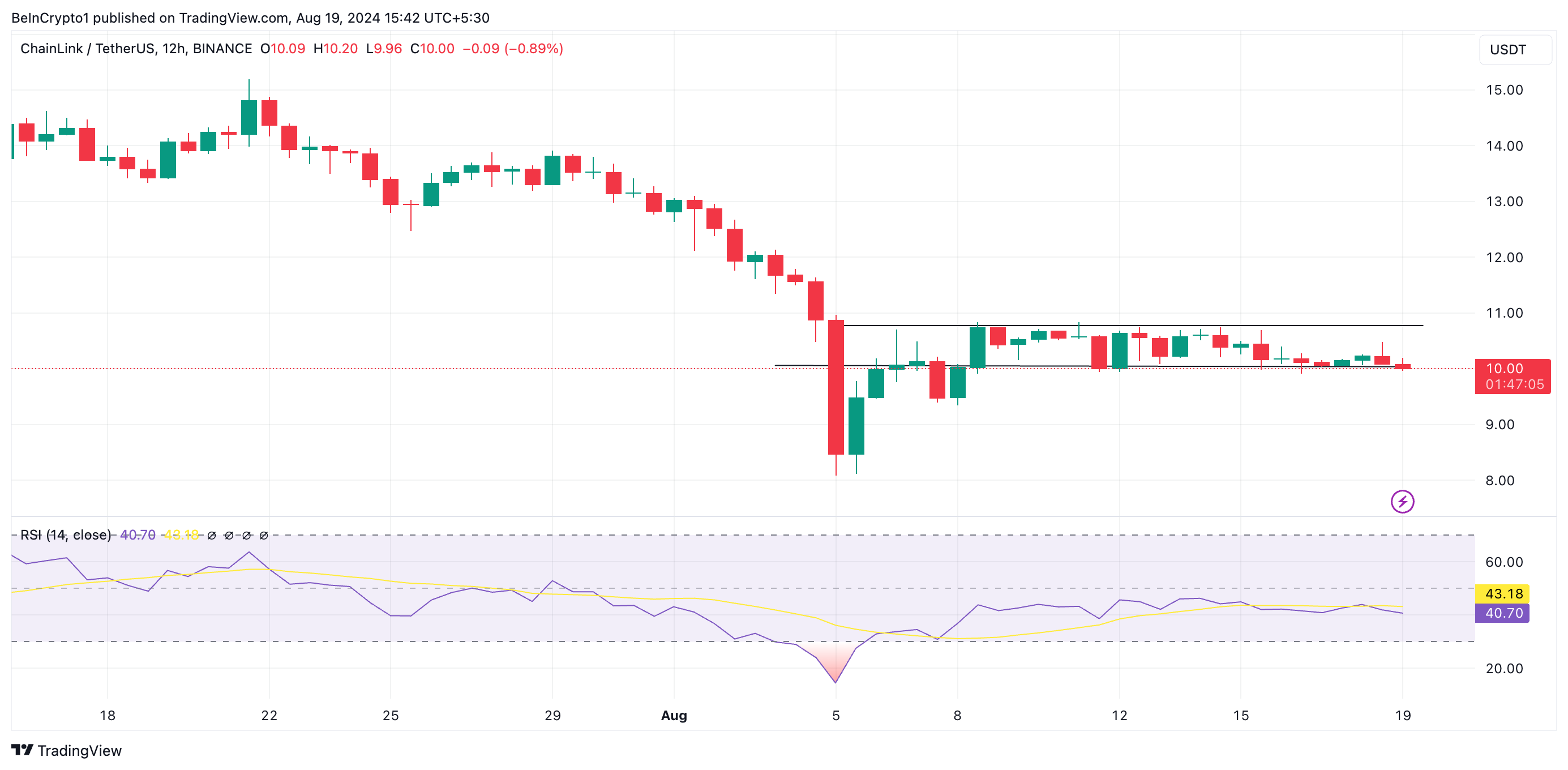 Detta kan ses på LINK:s platta Relative Strength Index (RSI). För närvarande är LINK:s RSI 40,83 och har varit platt sedan den 6 augusti.