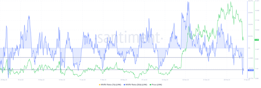 Detta stöds också av förhållandet mellan marknadsvärde och realiserat värde (MVRV). MVRV-förhållandet mäter investerarnas vinst / förlust. Chainlinks 30-dagars MVRV på 17.9% signalerar förluster, vilket potentiellt kan leda till ackumulering. Historiskt sett sker LINK-återhämtning vid -8% till -18% MVRV, vilket betecknar det som en möjlighetszon för ackumulering.