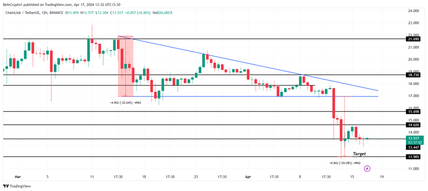 Det finns dock också en chans att altcoin kan falla genom stödet på $ 13.4 för att slå $ 12. Detta är målpriset markerat med den fallande triangeln Chainlinks pris, som LINK fastnade i för några dagar sedan.