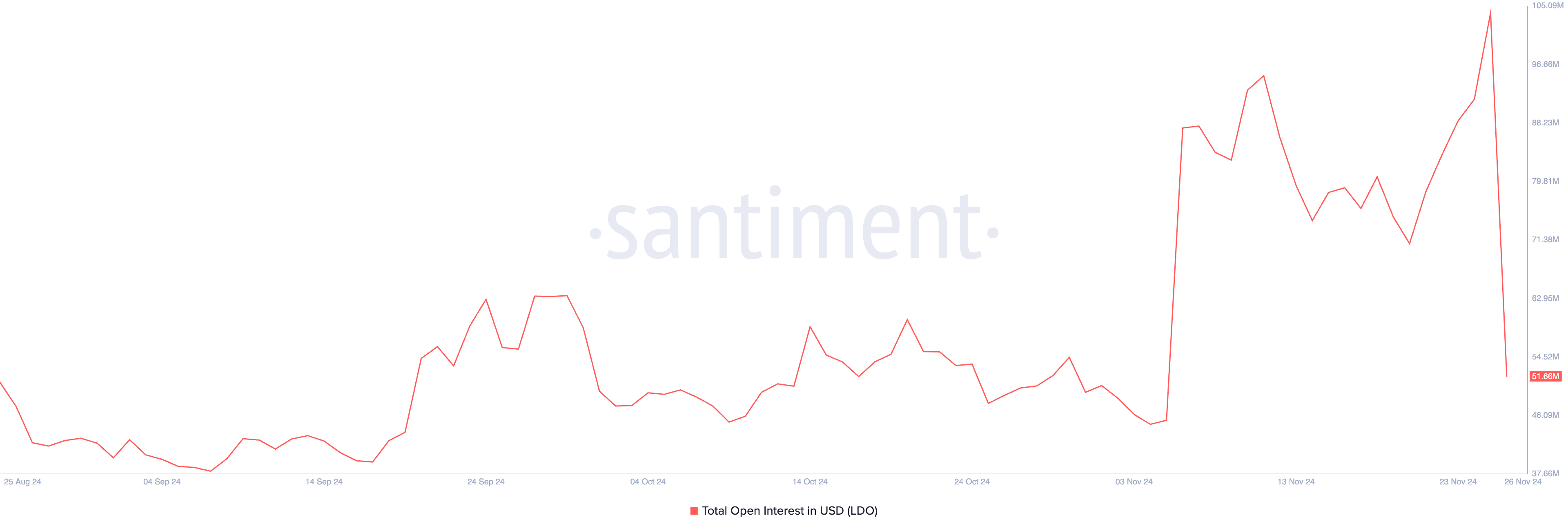 Men LDO:s 8 % uppgång har åtföljts av en betydande minskning i dess öppna intresse. Enligt Santiments data står detta på 52 miljoner USD vid pressens tidpunkt, vilket är en minskning med 50 % under de senaste 24 timmarna. Detta återspeglar en ökning i vinstuttag bland tokenens terminsinvesterare efter prisuppgången.