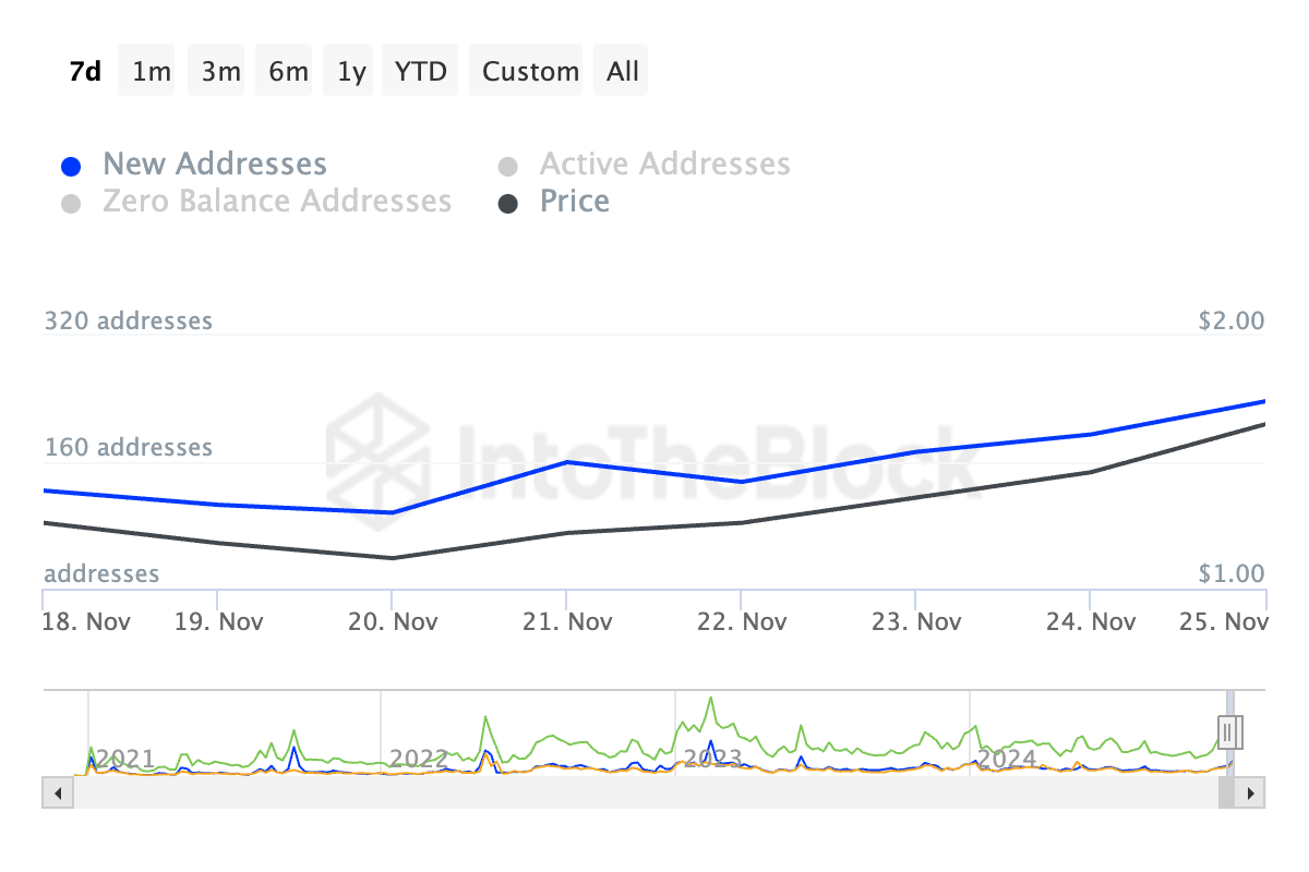 LDO:s uppgång under de senaste 24 timmarna har drivits av en märkbar ökning i efterfrågan under denna period. Enligt IntoTheBlock genomförde 891 unika adresser minst en LDO-transaktion i måndags, vilket är det högsta antalet på en dag sedan februari 2023.
