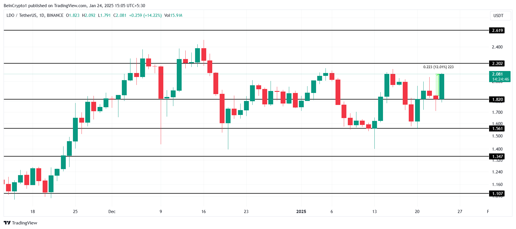 Lido DAO (LDO) ökar med 12 % i pris och handlas nu för 2,08 USD efter veckor av stillastående. Altcoinet är fast under en månadslång barriär på 2,20 USD och kan inte bryta igenom.