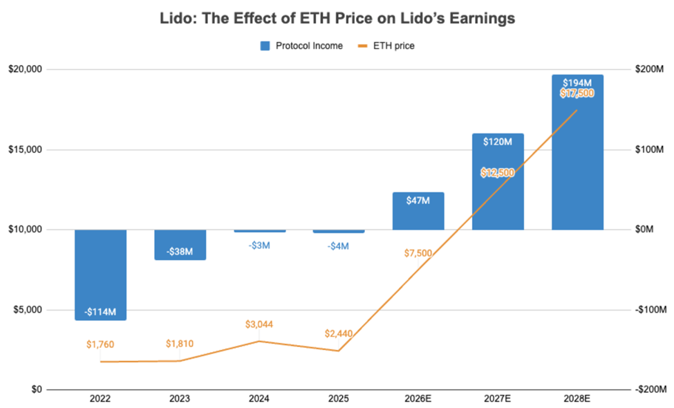 Om dessa förblir oförändrade, eller till och med försiktigt ökar till 50 miljoner USD, kan Lido generera tiotals miljoner i vinst enbart från Ethereums prisökning.