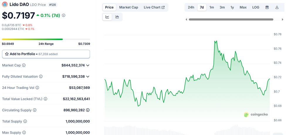 Enligt data på CoinGecko handlades LDO för 0,7197 USD, en ökning med blygsamma 0,1 % senaste veckan.