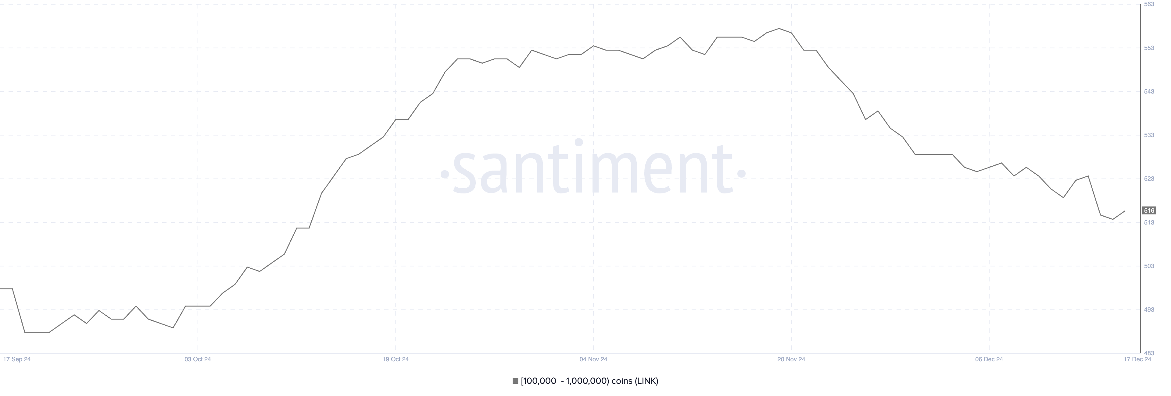 Antalet plånböcker som håller mellan 100 000 och 1 000 000 LINK har minskat till 516, från en tre månaders högsta på 558 den 19 november. Nyligen sjönk antalet från 524 den 14 december till 515 den 15 december, vilket indikerar en märkbar minskning av stora innehavare under en kort period.