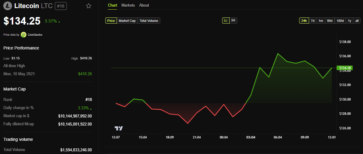 Nyheten påverkade dock inte Litecoin-priset nämnvärt. Det har bara stigit med 3,37 % sedan fredagens session öppnade. BeInCrypto-data visar att LTC handlades för 134,25 USD vid denna skrivning.