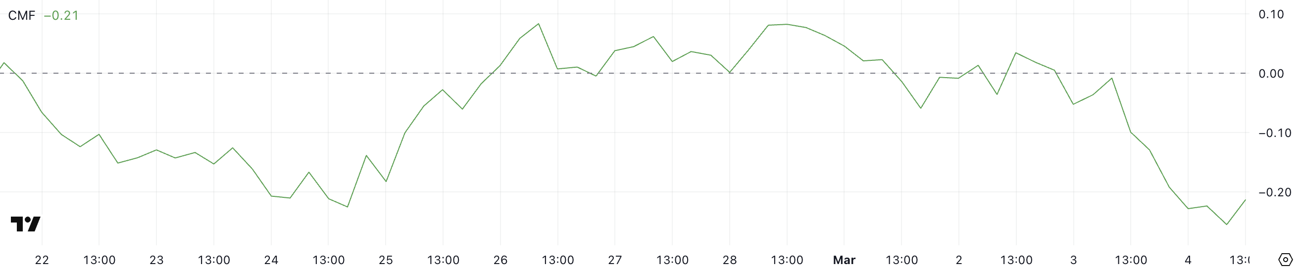 En fallande CMF tyder på att säljtrycket ökar, med mer kapital som flödar ut ur LTC än in i det.