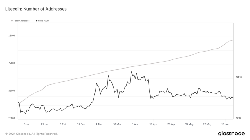 Det totala antalet adresser på Litecoin-blockkedjan ökade konsekvent från 283,80 miljoner den 1 juni till 287,42 miljoner den 16 juni. Detta motsvarar en tillväxt på cirka 1,28% under 16-dagarsperioden.