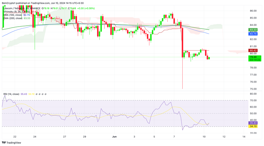 4-timmarsdiagrammet visar att Litecoin handlas 4% under kritiska EMA: 200-4H på $ 83 och 100-dagars på $ 82.
