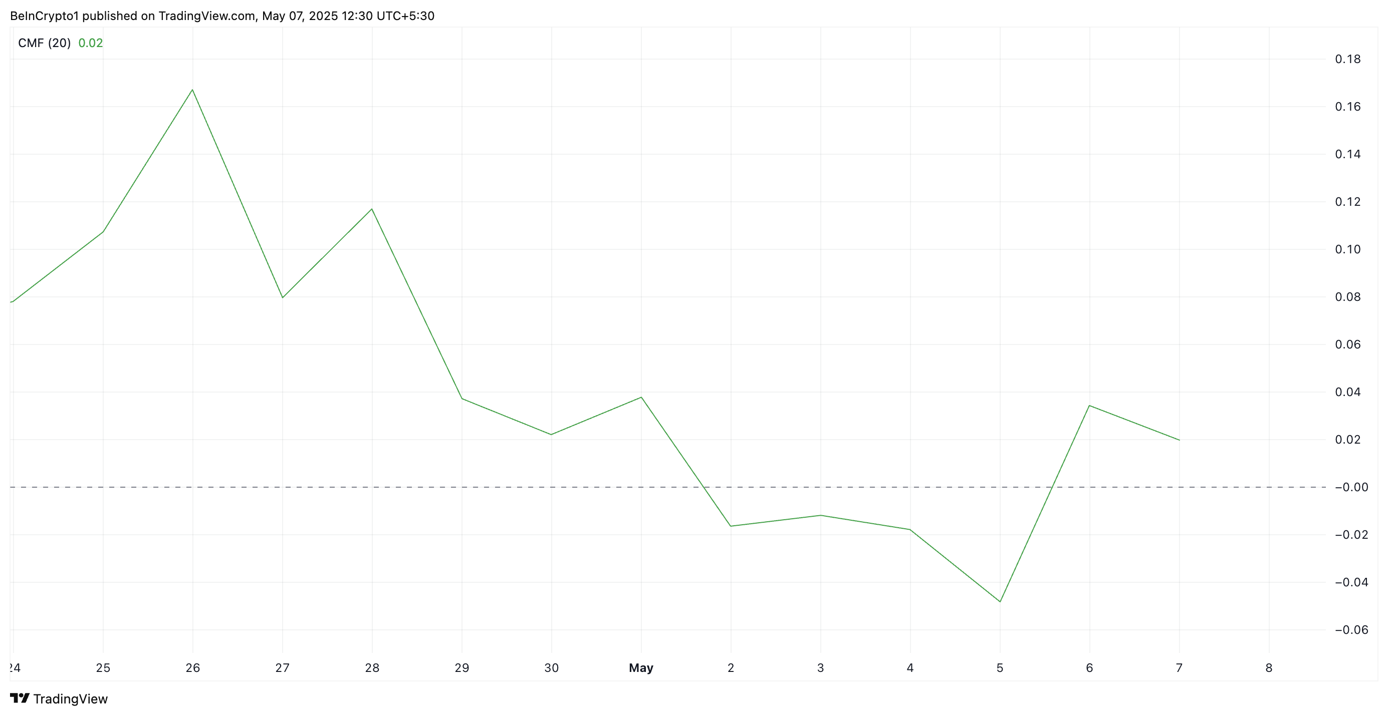 Trots LTC:s uppgång har till exempel dess Chaikin Money Flow (CMF), som mäter köp- och säljtryck, minskat och bildat en nedåtgående divergens. Avläsningar från det dagliga diagrammet visar att denna momentumindikator minskar och är på väg att bryta mittlinjen.