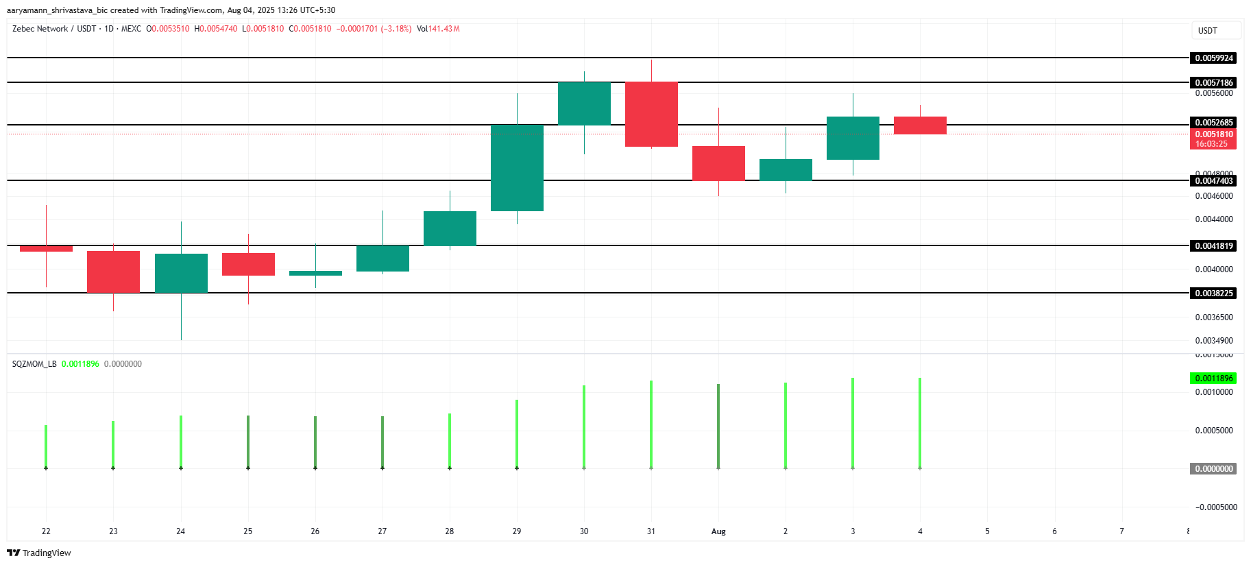 Squeeze Momentum Indicator signalerar en squeeze-release med positivt momentum då staplarna visar positivt tryck. Detta tyder på att ZBCN upplever en stark positiv trend, vilket kan hjälpa altcoinet att passera motståndet vid 0,0057 USD. Om det lyckas kan priset stiga mot 0,0059 USD.