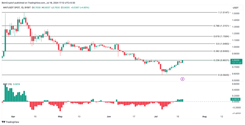 I skrivande stund handlas MNT för $0,79. Altcoinens pris har stigit med nästan 15% under de senaste sju dagarna. Anledningen till detta rally är inte långsökt. Bortsett från den bredare marknadskorrigeringen under den perioden har MNT också sett en ökning av efterfrågan.