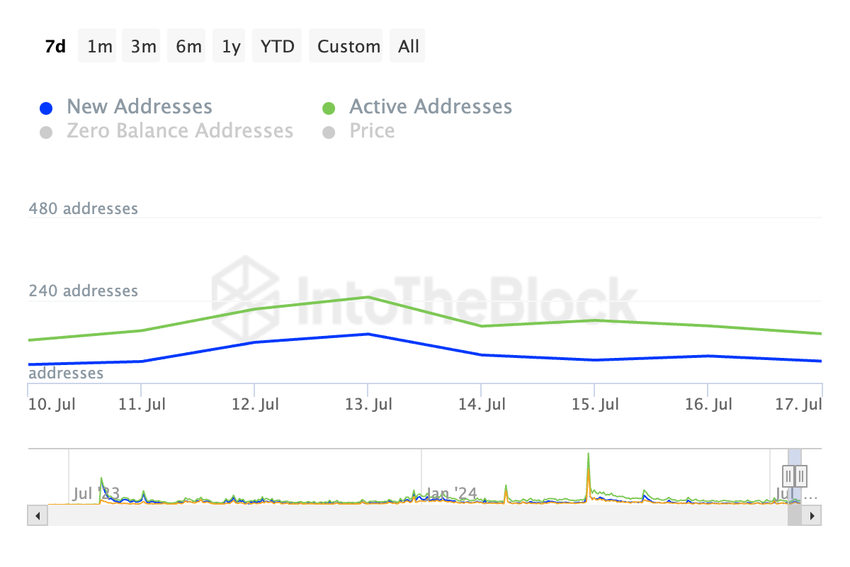 On-chain-data från IntoTheBlock avslöjar en ökning med 19 % av det dagliga antalet aktiva adresser som slutför minst en MNT-transaktion under den senaste veckan. Dessutom har antalet nya adresser som skapats för att handla med altcoin ökat med 15% under samma period.