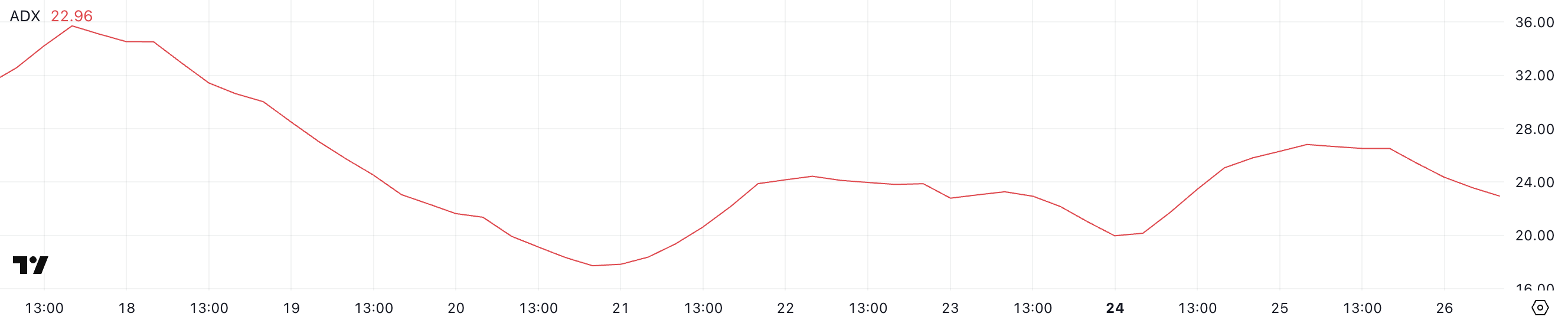 Mantras ADX är för närvarande 22,96, en minskning från 26,5 bara en dag sedan, vilket signalerar en försvagande trend. ADX, eller Average Directional Index, mäter styrkan i en trend utan att ange dess riktning.
