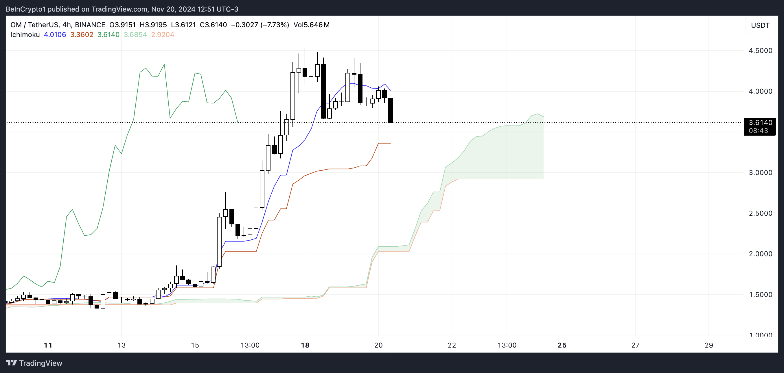 Ichimoku Cloud-diagrammet för OM visar att priset visar tecken på försvagning. Priset har fallit under Tenkan-sen (blå linje), vilket signalerar en förlust av kortsiktigt momentum, och det närmar sig nu den nedre gränsen av det gröna molnet (Kumo).