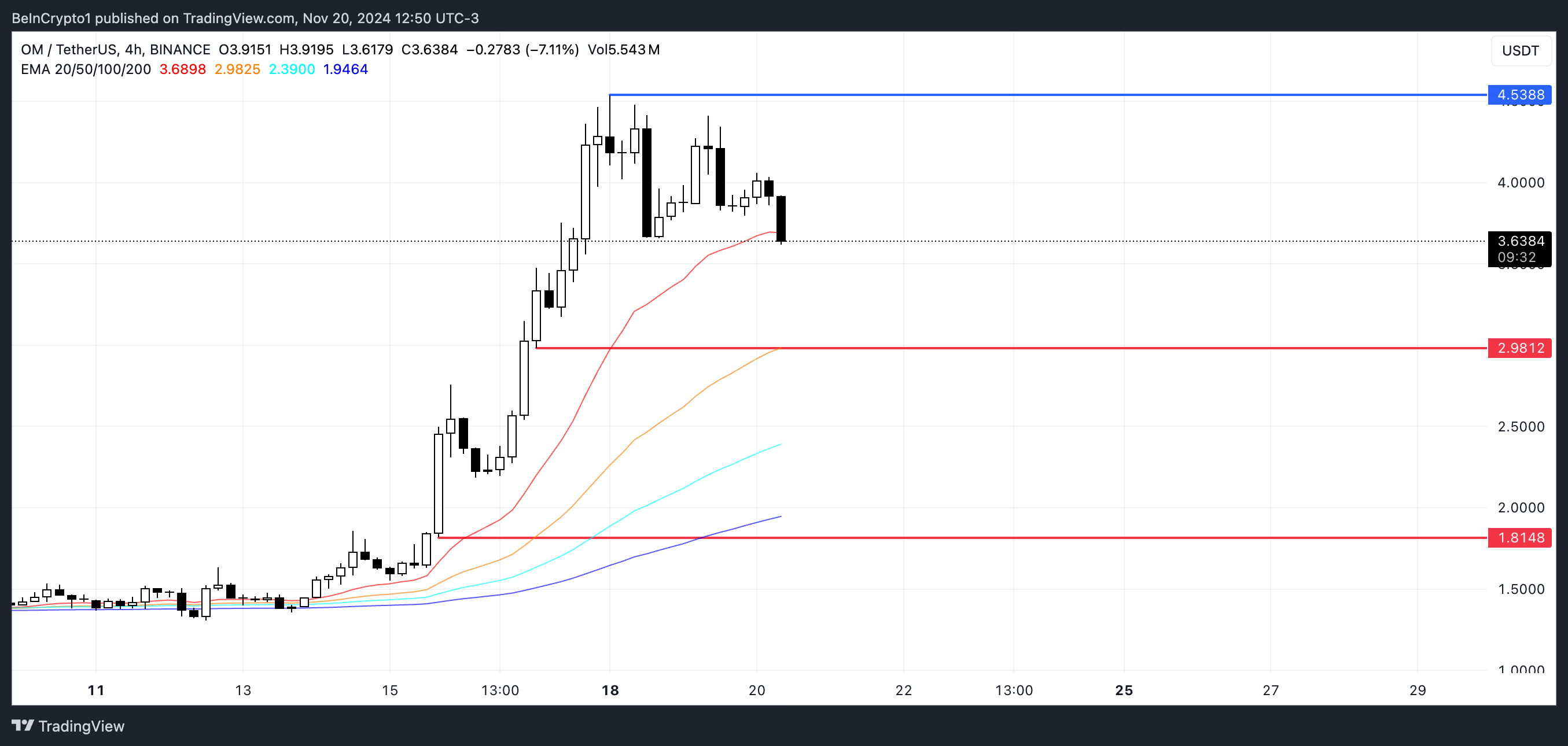 Om OM:s nedtrend fortsätter att stärkas, kan det testa sin närmaste stödzon vid 2,98 USD. Om denna nivå inte håller, kan priset falla ytterligare, potentiellt nå så lågt som 1,81 USD.