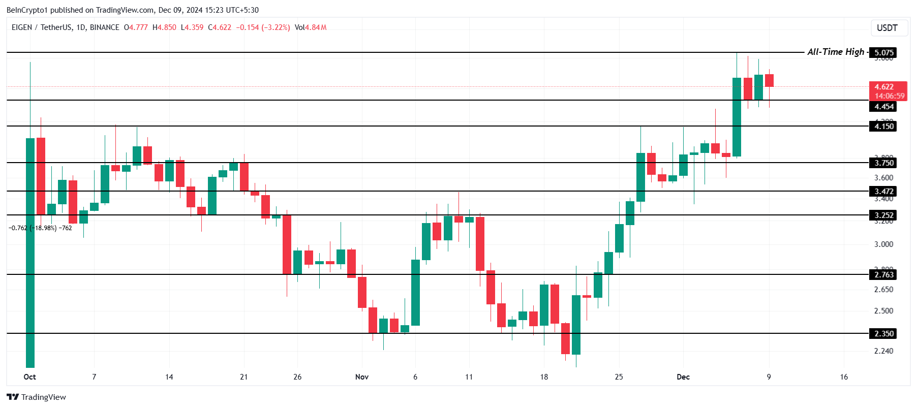 Med tanke på förväntningarna kring Rewards V2-uppgraderingen kan EIGEN-priset uppleva en betydande ökning. Men om altcoinet misslyckas med att överträffa sin ATH på 5,07 USD kan det konsolideras inom ett intervall mellan 4,45 USD och den tidigare höjden. Detta scenario skulle antyda en tillfällig paus innan ett möjligt utbrott eller ytterligare reträtt.