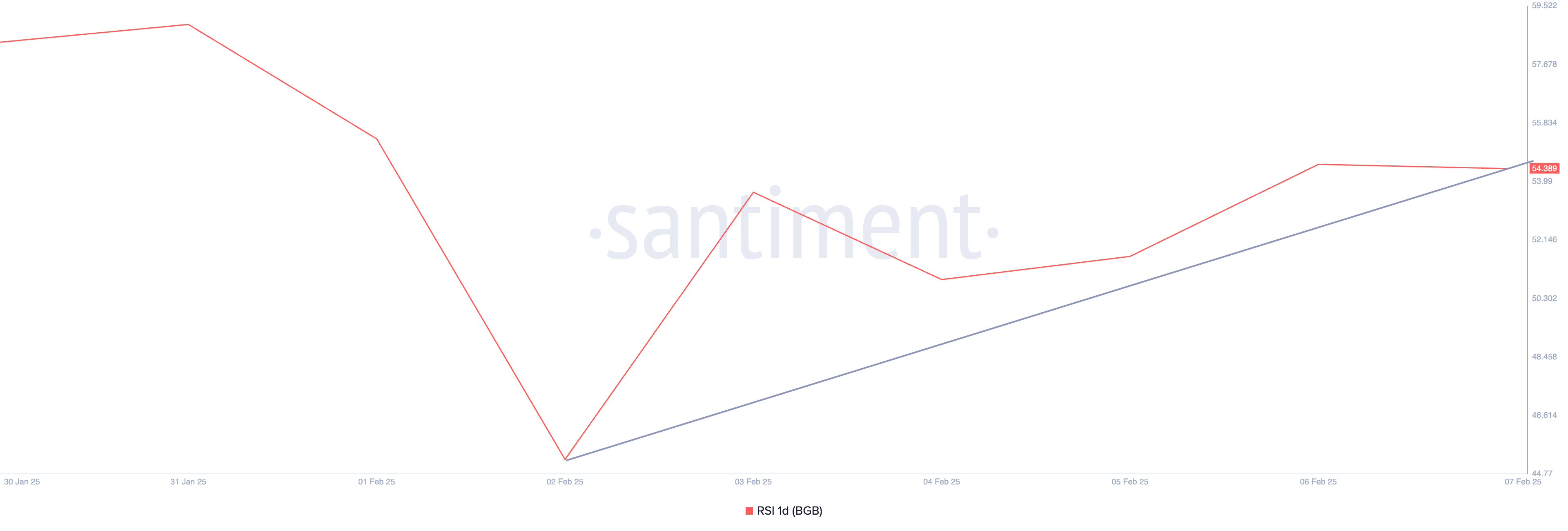 Enligt on-chain data bekräftar den stadiga ökningen i BGB:s Relative Strength Index (RSI) denna ackumulationstrend. Just nu är den viktiga momentumindikatorn på 54,38 och i en uppåtgående trend.