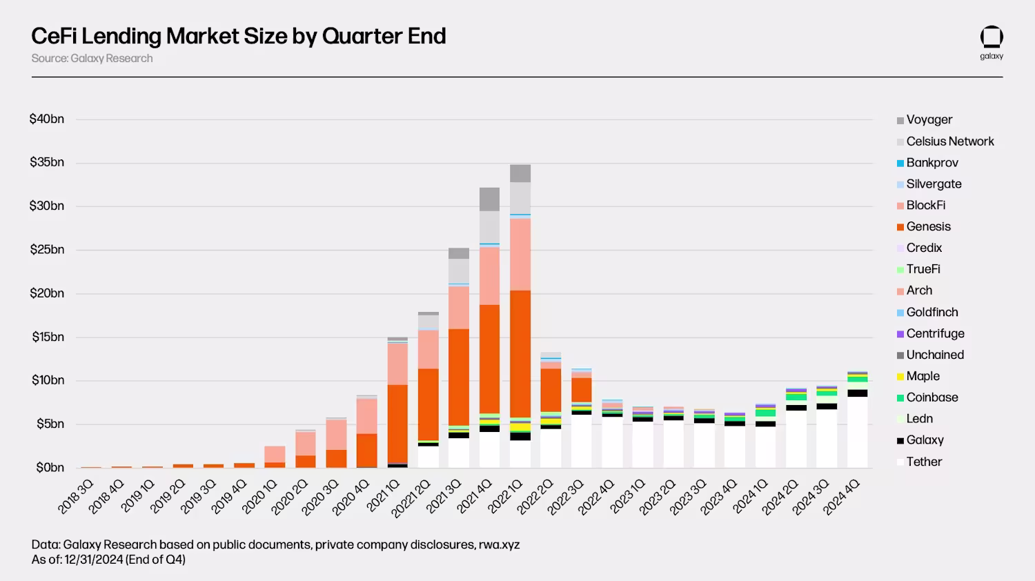 Enligt en ny rapport från Galaxy Digital var den totala storleken på utestående CeFi-lån i Q4 2024 11,2 miljarder USD. Detta var en ökning med 73% från björnmarknadens botten när det nådde 6,4 miljarder USD.