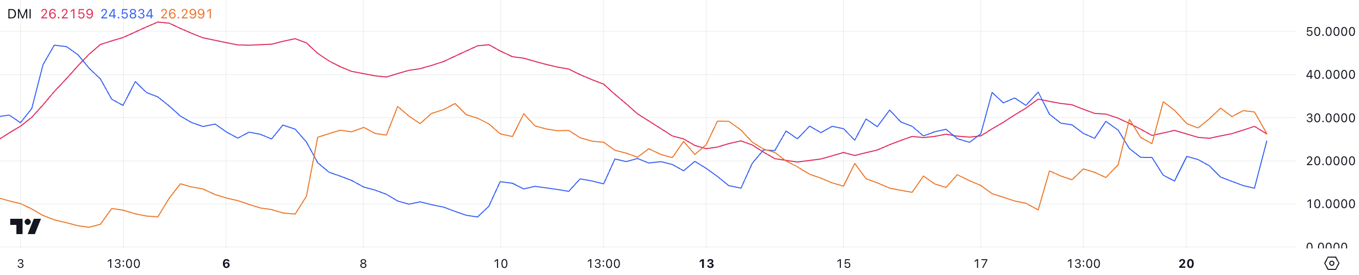 +DI är på 24,5, medan -DI är på 26,2, vilket indikerar att säljtrycket marginellt har överträffat köpmomentet, vilket signalerar potentiell kortsiktig konsolidering eller korrigering.