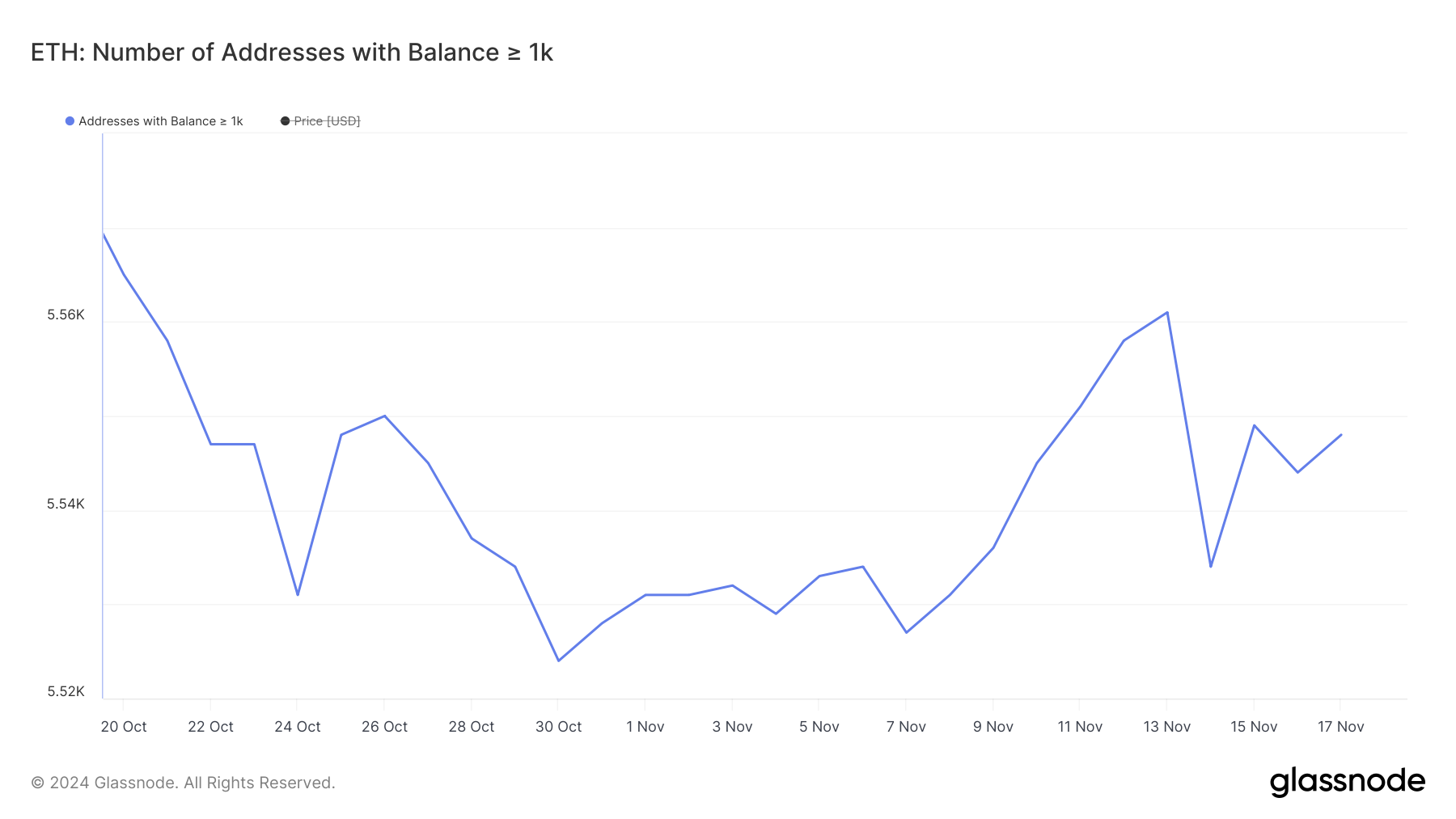 Mellan den 7 och 13 november ökade antalet valar som håller minst 1 000 ETH markant från 5 527 till 5 561. Detta markerade en av de största tillväxtperioderna för detta mått under 2024, vilket signalerar stark ackumulation av stora innehavare.