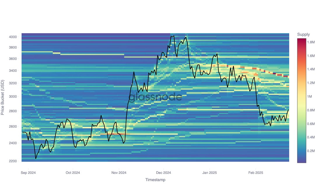 Ethereums marknadssentiment visar investerarnas övertygelse genom Cost Basis Distribution (CBD) data. Enligt Glassnode visar CBD att investerare konsekvent har köpt Ethereum även när priset sjönk. Flera kostnadsbaser rör sig lägre, vilket indikerar att marknadsdeltagare utnyttjar prisfallet.