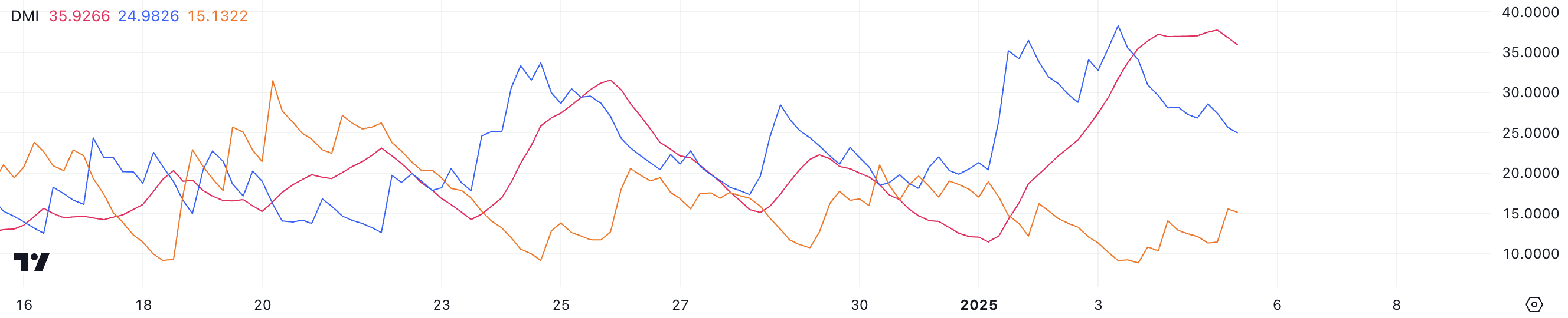 Average Directional Index (ADX) för Hedera är för närvarande på 35,9, vilket återspeglar en stark trendstyrka, även om den har minskat något från 37,7 för några timmar sedan. ADX mäter styrkan i en trend på en skala från 0 till 100, där värden över 25 indikerar en stark trend och värden under 20 signalerar svagt eller obefintligt momentum.