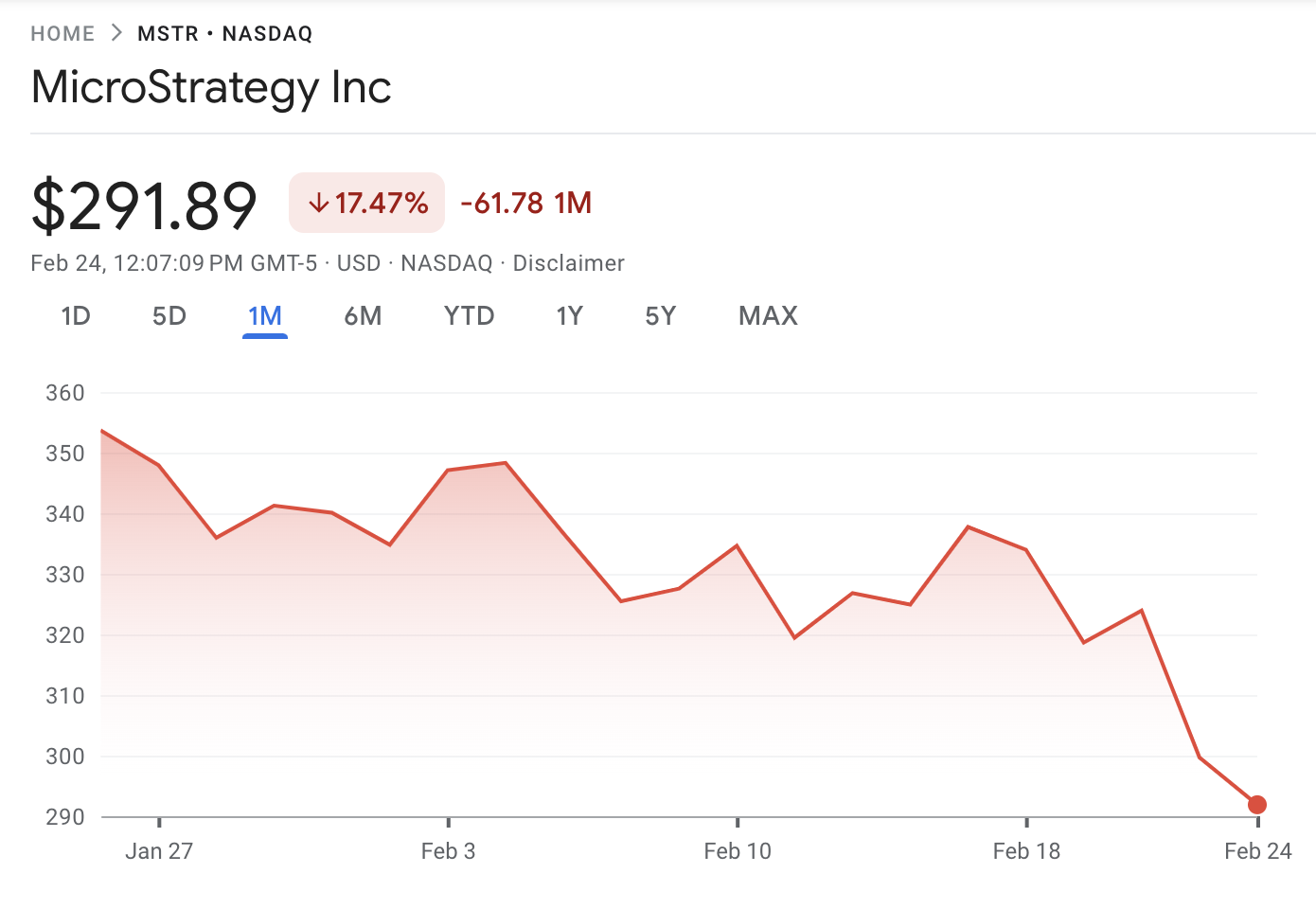 Saylor har fortsatt med dessa stora Bitcoin-köp i månader, men det fanns flera betydande uppehåll i februari. Trots det senaste köpet har företagets aktie MSTR underpresterat hittills i år.