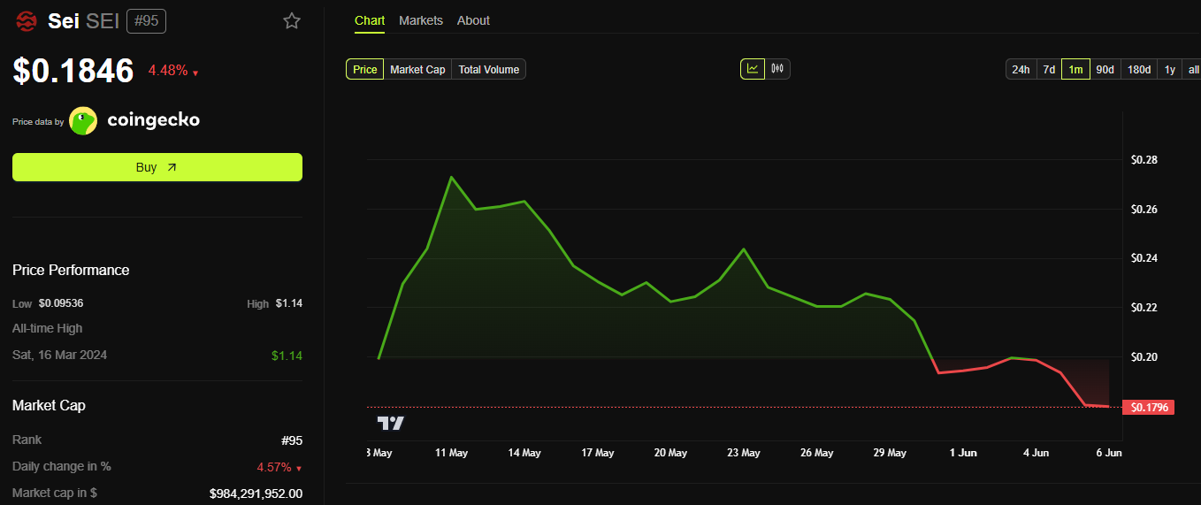 Trots ekosystemets starka utveckling har priset på SEI inte speglat denna tillväxt. Enligt BeInCrypto sjönk SEI:s pris med mer än 30 % i maj 2025. Denna nedgång har väckt oro bland investerare.