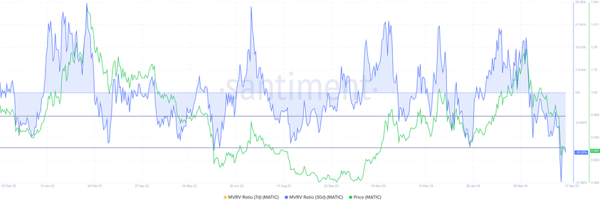 MMATICs priskorrigering har förvärrat förlusterna till den grad att investerare nu väljer att inte sälja sina innehav, eftersom de inte kan kompensera för sina förluster. Istället framstår altcoinen som en bättre möjlighet för ackumulering. Detta återspeglas i förhållandet mellan marknadsvärde och realiserat värde (MVRV). MVRV-förhållandet övervakar investerarnas vinster och förluster. Polygons nuvarande 30-dagars MVRV på -19% innebär förluster, vilket potentiellt kan leda till ackumulering. Historiskt sett tenderar MATIC att åter hämta sig inom intervallet -8% till -18%, vilket betecknar det som en möjlighetszon.