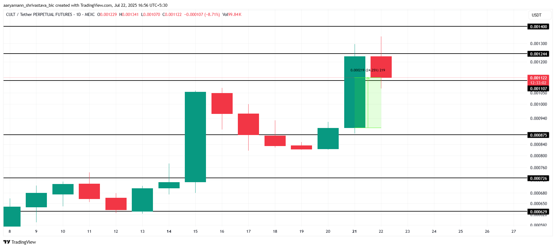 CULT handlas för närvarande till 0,00112 USD, vilket innebär en ökning på 24 % de senaste 24 timmarna. Meme coinen visar starkt uppåtgående momentum och närmar sig motståndet vid 0,00124 USD. Om den positiva trenden fortsätter kan CULT testa denna viktiga nivå inom de närmaste timmarna, vilket kan leda till potentiella vinster.