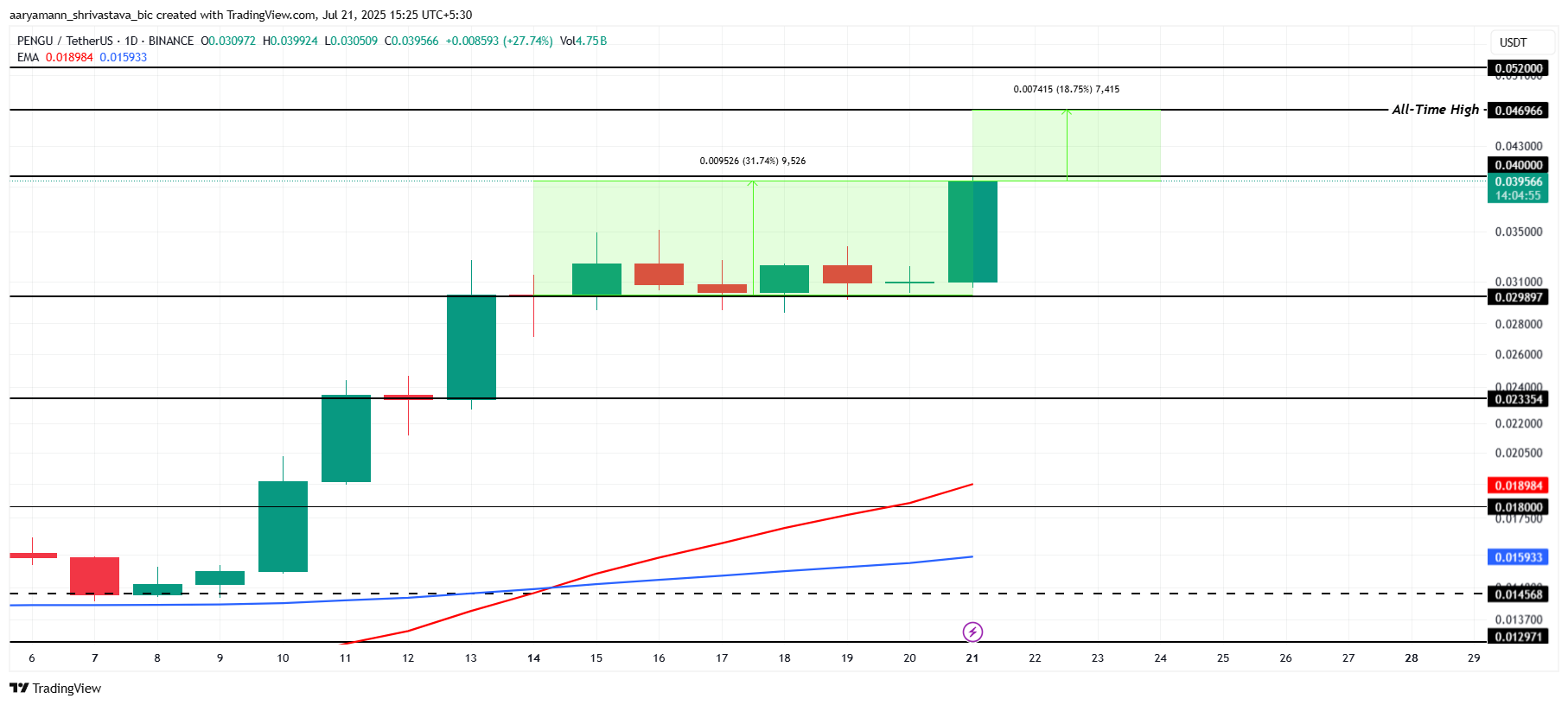 PENGU-priset har ökat med 31 % den senaste veckan och handlas nu till 0,039 USD. Meme coinet närmar sig sitt högsta värde någonsin på 0,046 USD.