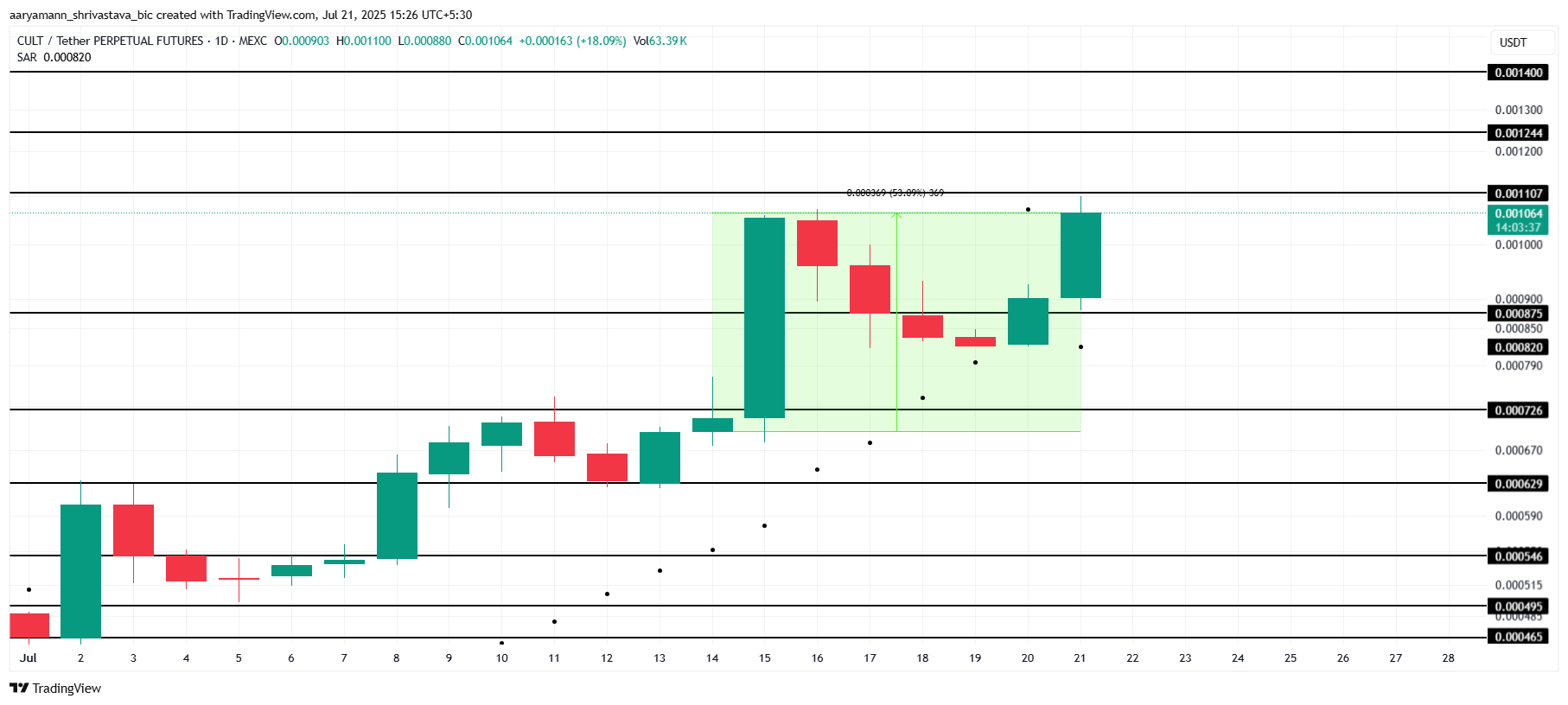 CULT får gradvis positivt momentum efter en ökning på 53 % den senaste veckan och handlas nu till 0,00106 USD. Denna uppgång markerar en potentiell utbrottfas, med meme coinet som nu siktar på det kritiska motståndet vid 0,00110 USD.