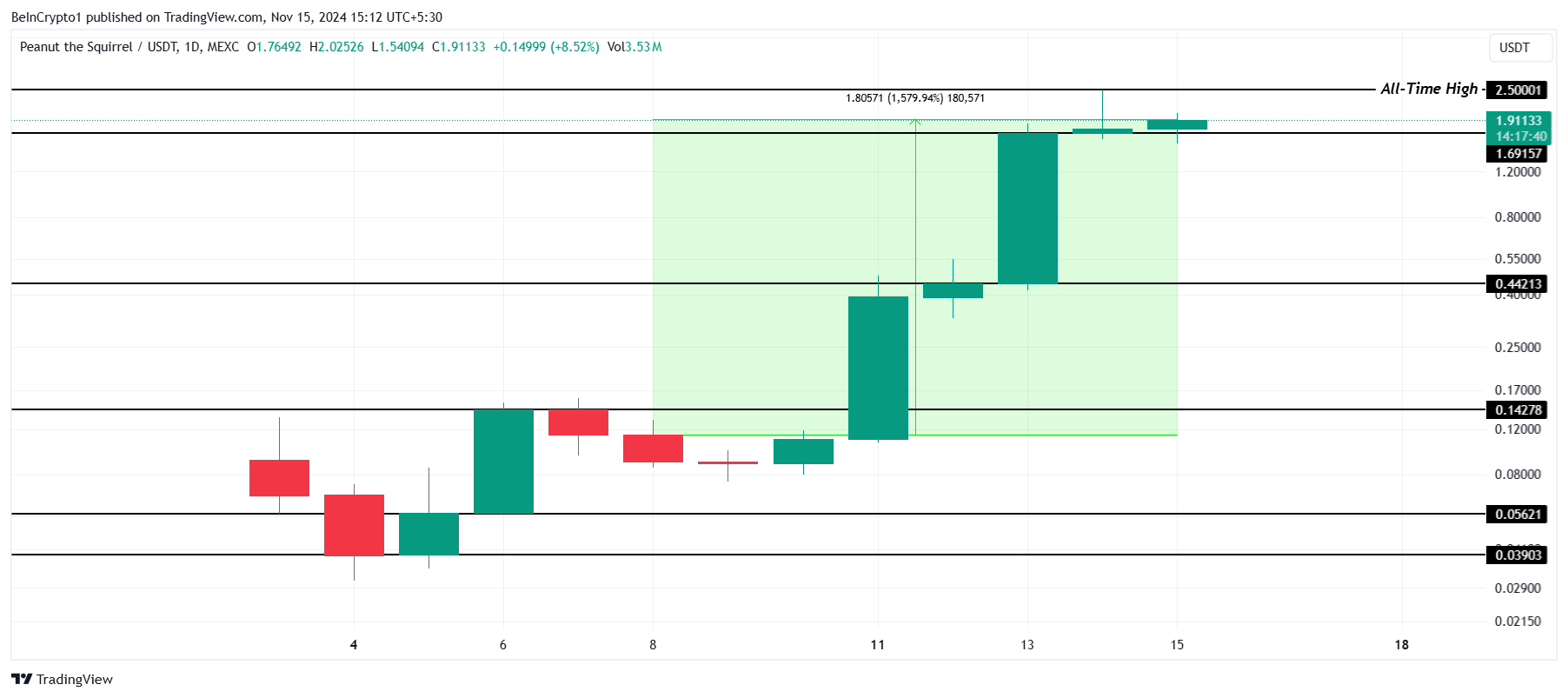 Den imponerande prestationen ledde till att PNUT satte flera nya rekordhöga nivåer denna vecka, med den senaste högsta noteringen på 2,50 USD. Om den hausseartade momentet håller i sig, kan meme-myntet fortsätta att klättra, potentiellt sätta nya rekordhöga nivåer och ytterligare befästa sin position på marknaden.