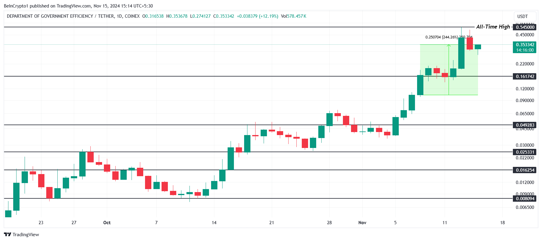 Å andra sidan, om DOGE(GOV) håller sig över stödnivån på 0,161 USD, kan den återfå uppåtgående momentum. Att framgångsrikt upprätthålla denna nivå kan låta meme-myntet återbesöka sin rekordhöga nivå på 0,545 USD, ogiltigförklara den baisseartade utsikten och bana väg för ytterligare vinster.