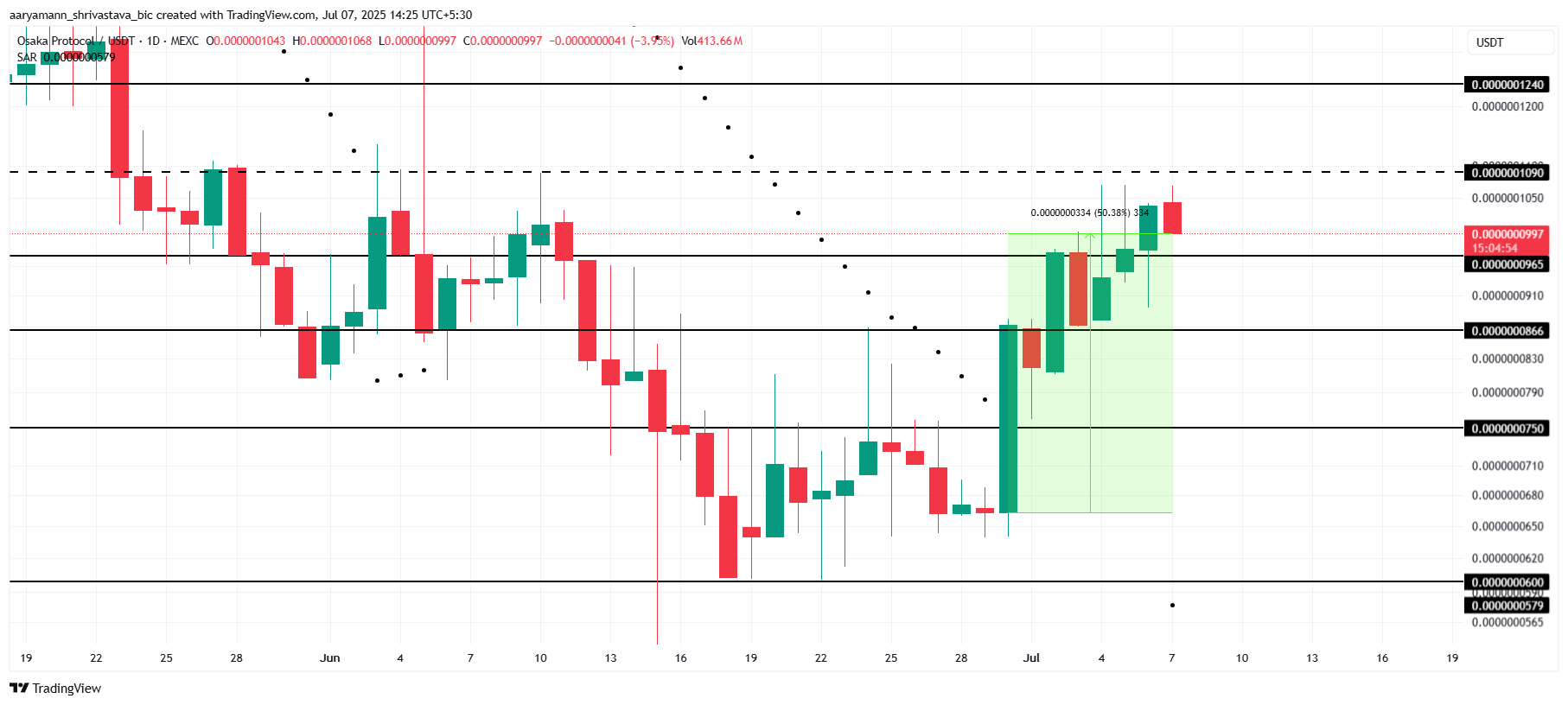 Nästa mål för OSAK är att bryta motståndsnivån på 0,0000001090 USD och pressa mot 0,0000001240 USD. Parabolic SAR under ljusstakarna fungerar som stöd och signalerar en aktiv uppåtgående trend. Denna positiva indikator antyder att meme-myntet har potential att fortsätta stiga om marknadsförhållandena förblir gynnsamma.