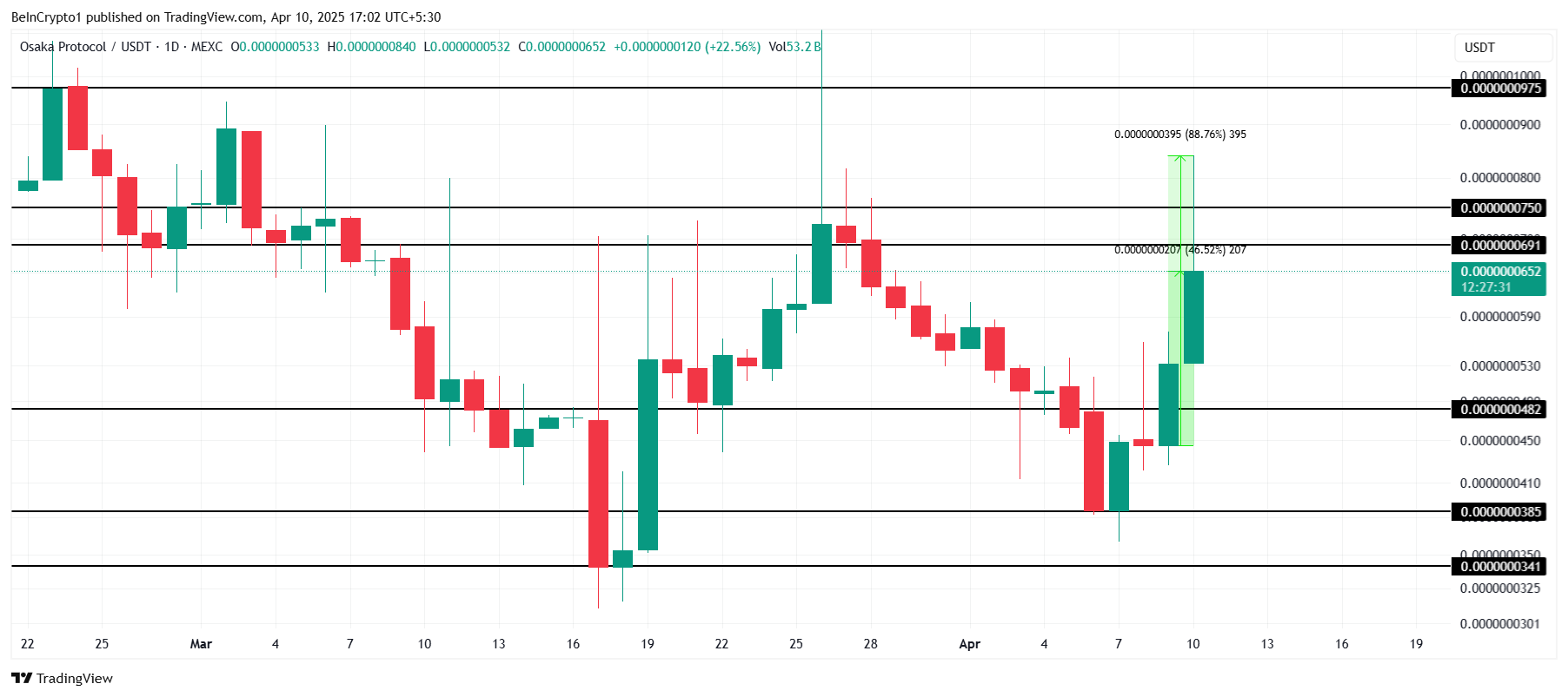 Meme-myntet närmar sig det viktiga motståndet vid 0,0000000750 USD, med potential att omvandla denna nivå till stöd. Om det lyckas kan OSAK stiga till 0,0000000975 USD, vilket lockar fler köpare och stärker investerarnas förtroende. En fortsatt uppgång skulle ytterligare befästa den positiva utsikten för meme-myntet.