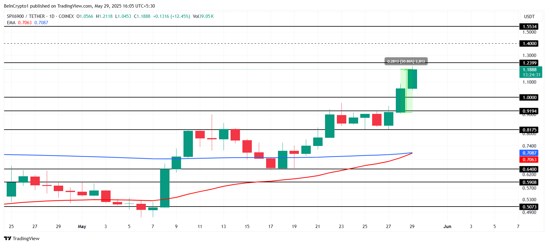 SPX steg nästan 31 % de senaste 24 timmarna och handlas nu för 1,18 USD, strax under motståndet på 1,23 USD. Detta momentum tyder på att meme coinen är redo att fortsätta stiga, drivet av ökat investerarintresse och positiv marknadssentiment.