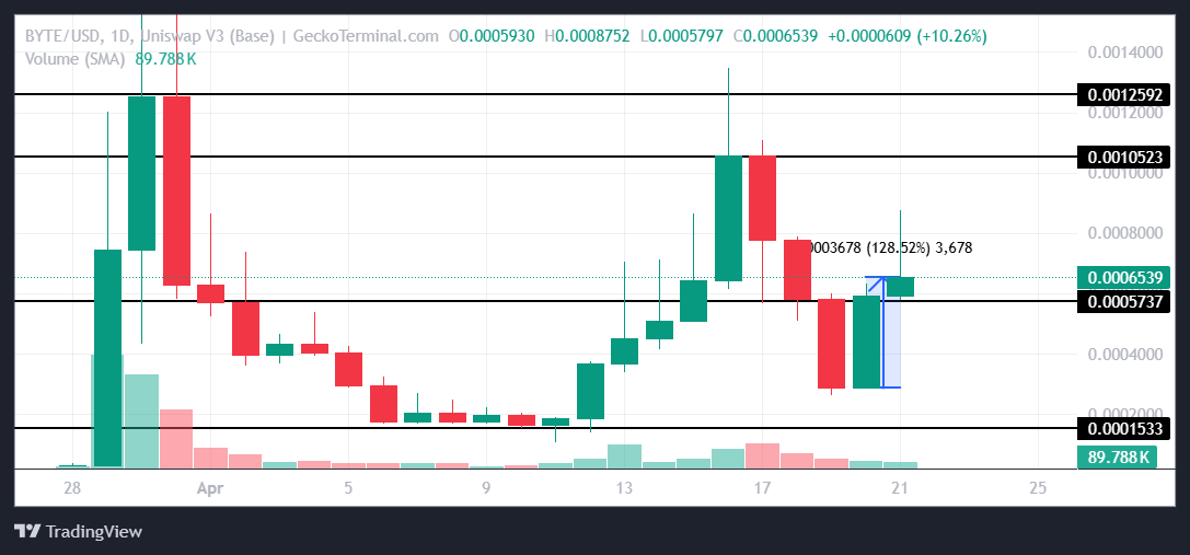 Detta förväntas också återspeglas i prisutvecklingen de kommande dagarna. BYTE, som handlas för 0,0006539 USD, håller sig över stödet på 0,0005737 USD. Att säkra det som stöd kan driva meme-myntet uppåt mot motståndet på 0,0010523 USD, vilket ökar investerarnas vinster.
