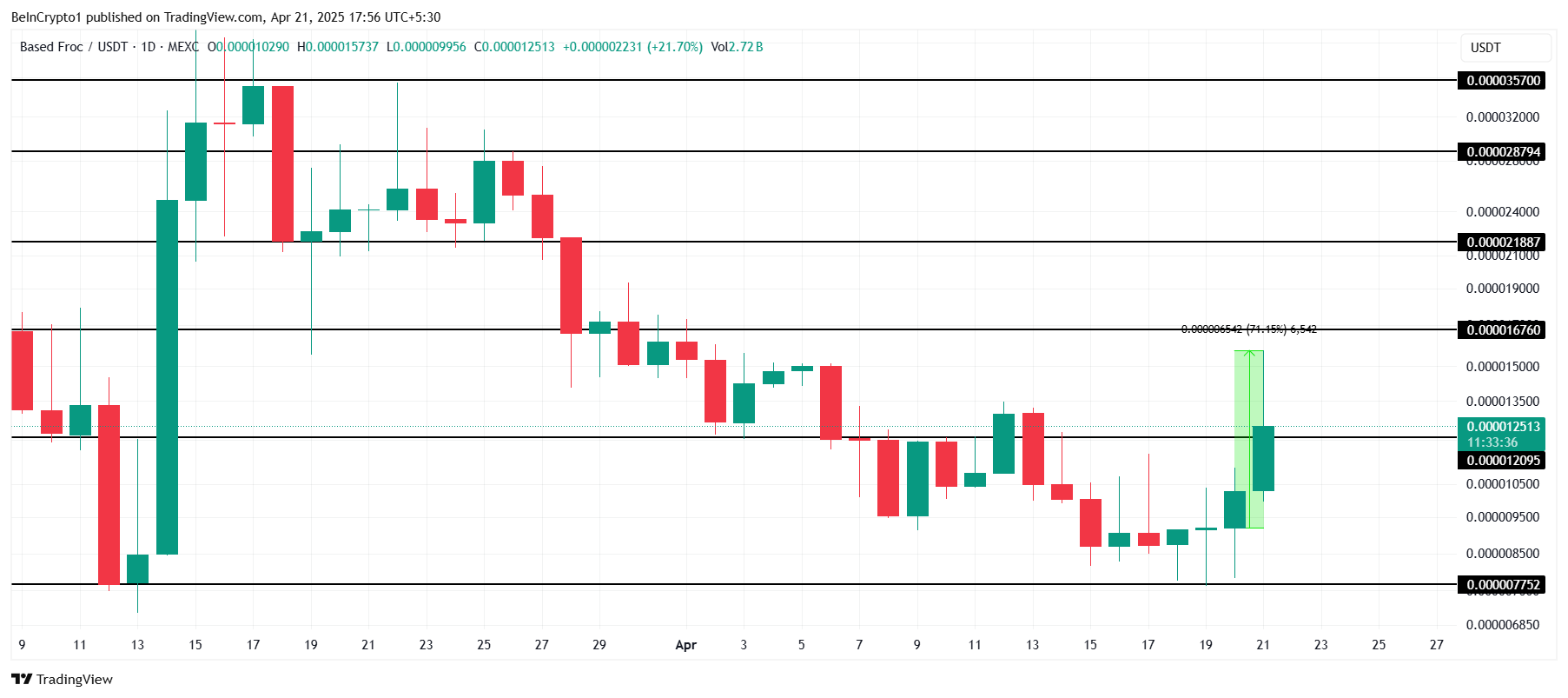 Based Froc (FROC) ledde dagens vinnarlista och steg nästan 71 % under dagens högsta för att ta förstaplatsen i CoinGeckos “groda-tema” kategori. FROC fick först uppmärksamhet i mitten av februari när en Coinbase-ingenjör introducerade det med Clanker, en AI-driven token-skaparbot från Farcaster.