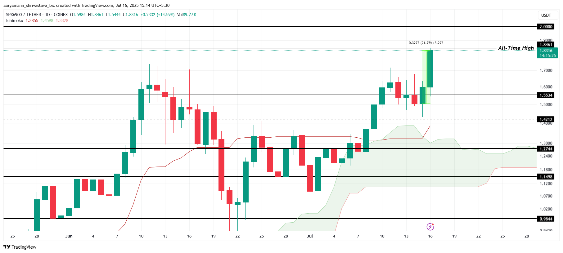 Ichimoku-molnet, som ligger under ljusstakarna, signalerar att den positiva trenden för SPX just nu dominerar. Denna tekniska indikator antyder att altcoinet kan fortsätta sin uppgång och potentiellt bryta 2,00 USD-nivån inom en snar framtid. Om trenden fortsätter kan SPX sätta nya prisrekord.