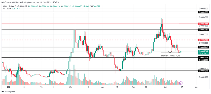 BONK-priset som handlas till $0,00002519 har redan sjunkit med mer än 40% på det dagliga diagrammet under de senaste två veckorna. Detta har lett till att meme-myntet har fallit från $0,00004114 till marknadspriset. Området mellan $0,00002748 och $0,00002153 har testats som konsolidering tidigare, vilket är ett kritiskt stödområde.
