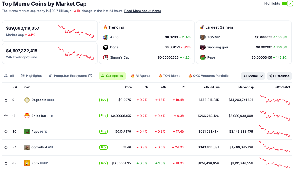 En gång en blomstrande del av kryptoekosystemet har meme coin-sektorn nyligen sett sin marknadskapitalisering sjunka under 40 miljarder USD. Enligt CoinGecko ligger den nu på 39,69 miljarder USD, vilket är en minskning med 3% under de senaste 24 timmarna och över 12% under den senaste veckan.