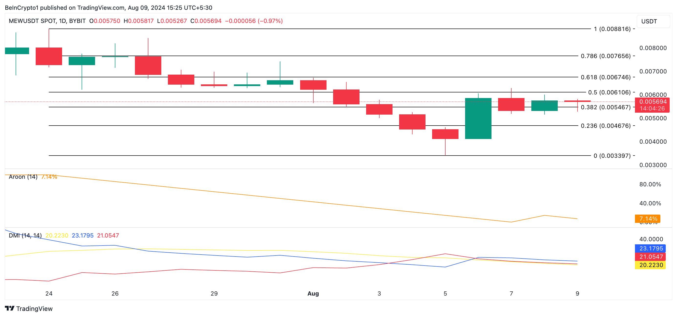 Vid skrivtillfället handlas MEW för $0,0057. Momentumindikatorer på endagsdiagrammet tyder dock på en försvagad uppåtgående trend. Till exempel har dess Aroon Up Line sjunkit med 7,14%.