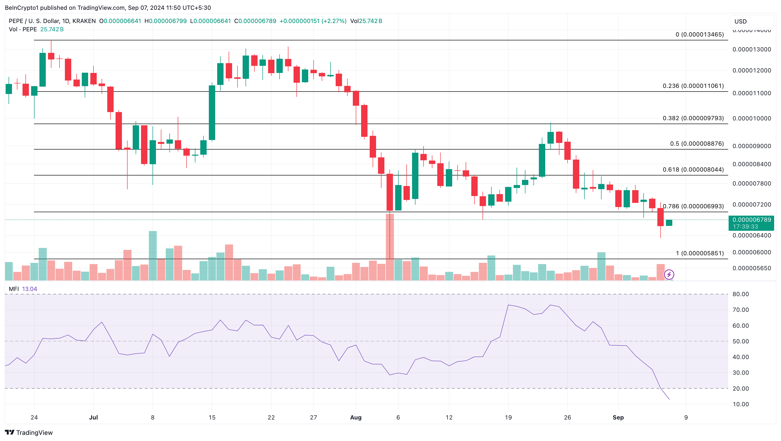När indikatorvärdet är över 80,00 är en kryptovaluta överköpt. Å andra sidan betyder ett värde under 20,00 att den är översåld. Enligt det dagliga diagrammet är MFI nere på 13,40, vilket betyder att PEPE är översåld, och en återhämtning kan vara nära.