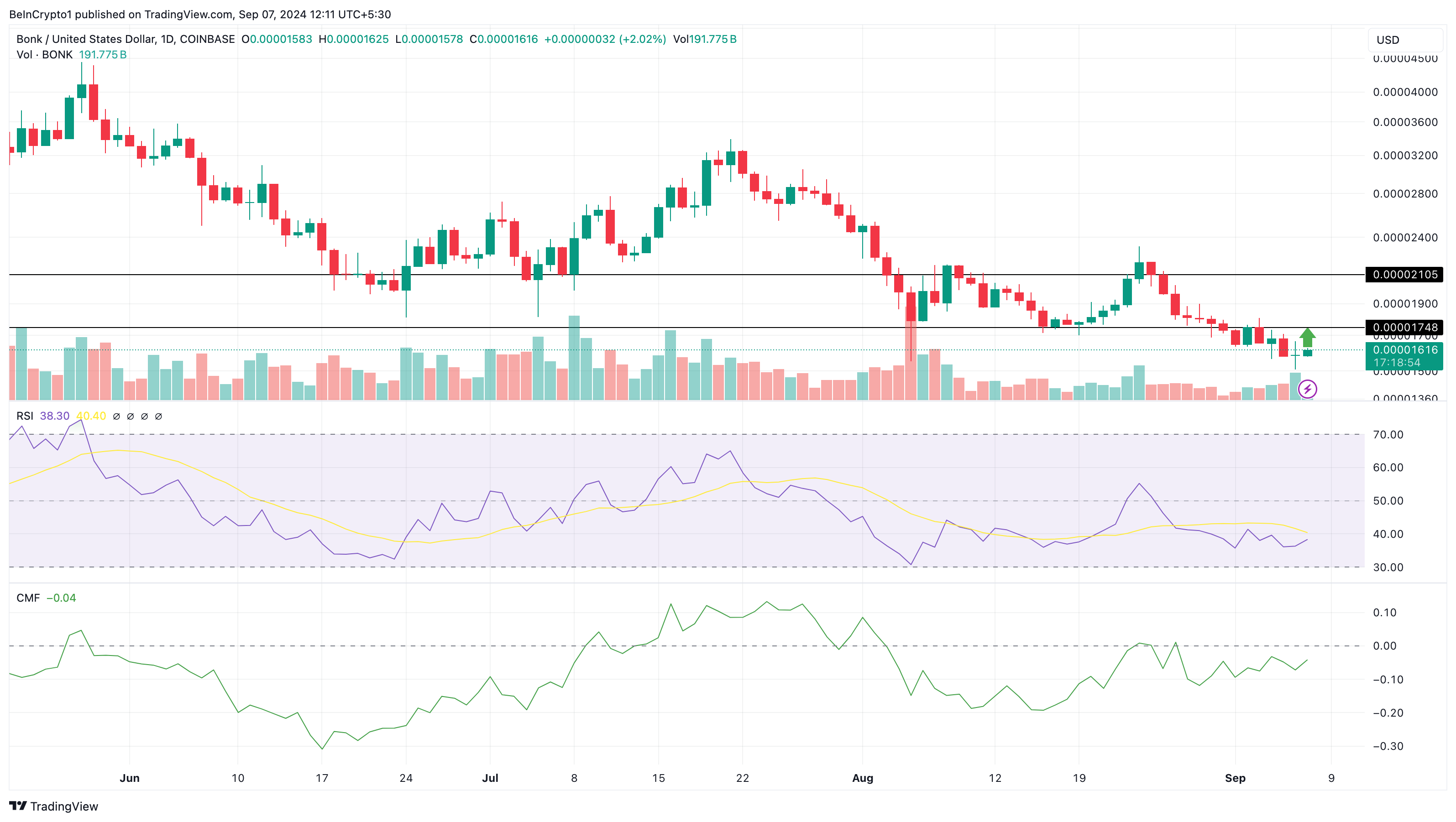 När den används tillsammans med andra indikatorer hjälper CMF till att avgöra om en kryptovaluta sannolikt kommer att gå in i en upp- eller nedtrend. I BONKs fall kan priset röra sig högre om CMF så småningom korsar över den neutrala linjen. Om detta inträffar kan mememyntet testa stödet vid 0,000017 USD och potentiellt nå 0,000020 USD.
