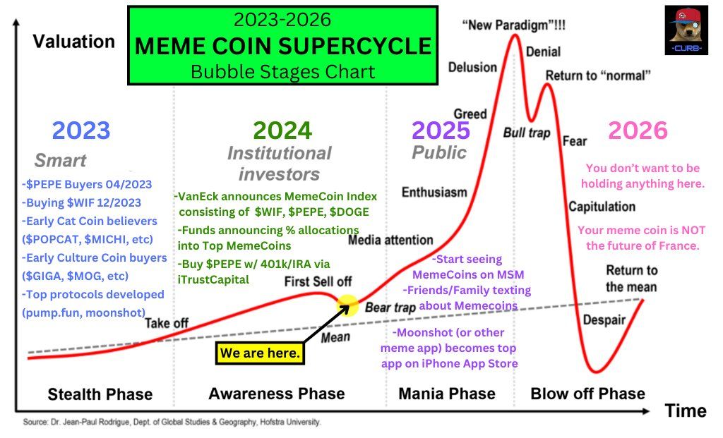 Investeraren Curb använder en bubbelväxtmodell och förutspår att meme-mynt bara är i början av denna cykel. Vid tidpunkten för skrivandet har marknadsvärdet för meme-mynt nått 58,3 miljarder USD, en ökning med 2,8% under de senaste 24 timmarna enligt Coingecko.